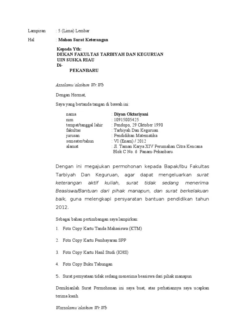 Fotocopy kartu tanda mahasiswa (ktm); Dan aktif sebagai mahasiswa program sarjana atau diploma maksimal semester vi yang dibuktikan dengan surat keterangan aktif kuliah; . Surat keterangan aktif kuliah (asli) . Mahasiswa mengajukan permohonan pembuatan surat keterangan aktif kuliah atau keterangan beasiswa. Home » uncategories » format permohonan surat aktif kuliah dan pernyataan uin suska riau.